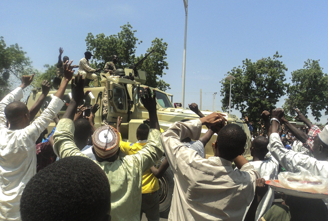 Stato di Borno, Nigeria, 17 settembre 2014. Un gruppo di residenti saluta i miliziani di Boko Haram che fanno il loro ingresso in località Konduga, a bordo di un carro armato. I miliziani islamisti continuano a mettere a ferro e fuoco i villaggi degli Stati nord-orientali del Paese, costringendo i cristiani a convertirsi: lo hanno denunciato oggi gli eletti dei tre Stati di Borno, Adamawa e Yobe davanti alla Camera dei Rappresentanti, che ha appena ripreso i lavori dopo due mesi di pausa.