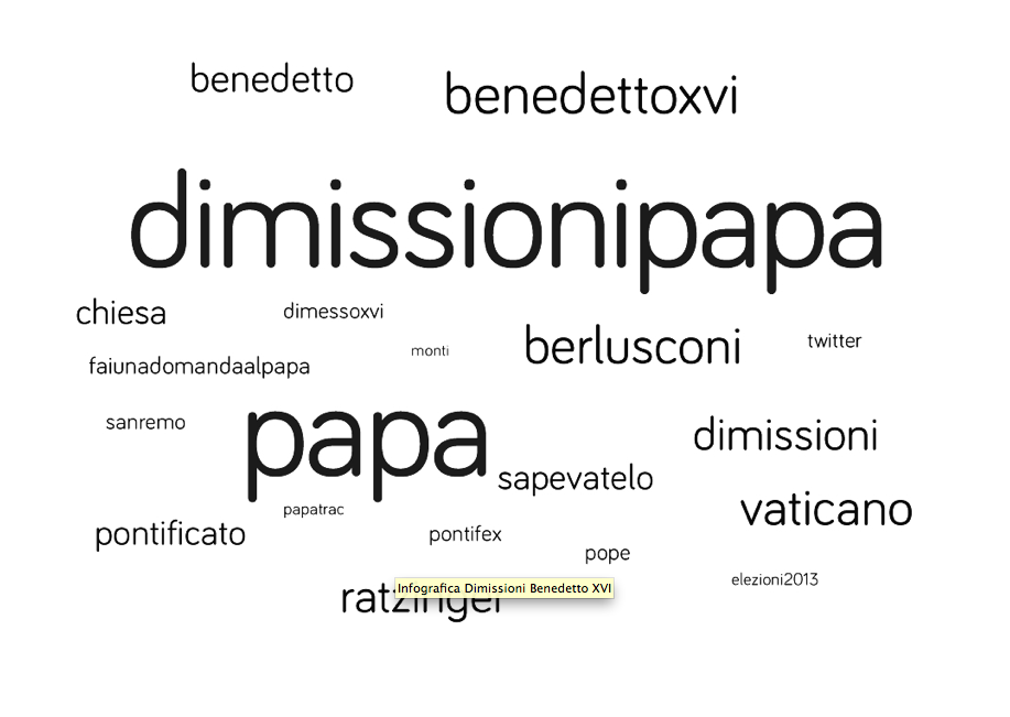 Almawave , società specializzata nell’analisi dell’eco che su Twitter producono gli eventi politici e mediatici del momento, ha messo sotto la lente d’ingrandimento questa volta l’effetto dimissioni di Benedetto XVI, conteggiando dalle 11.00 fino alle 14.00 di lunedì 11 febbraio 2013 il numero di tweet (16.333) e retweet (9.495) dedicati alla decisione del Papa. Non mancano le soprese: la fa da padrone, nei retweet, l’ironia, lo sfottò più o meno irriverente.