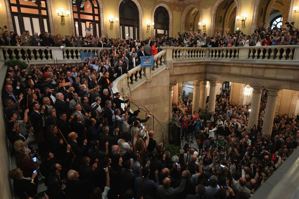Barcellona, 27 ottobre 2017 – I sindaci della Catalogna celebrano alla notizia della votazione favorevole del parlamento all’indipendenza dalla Spagna