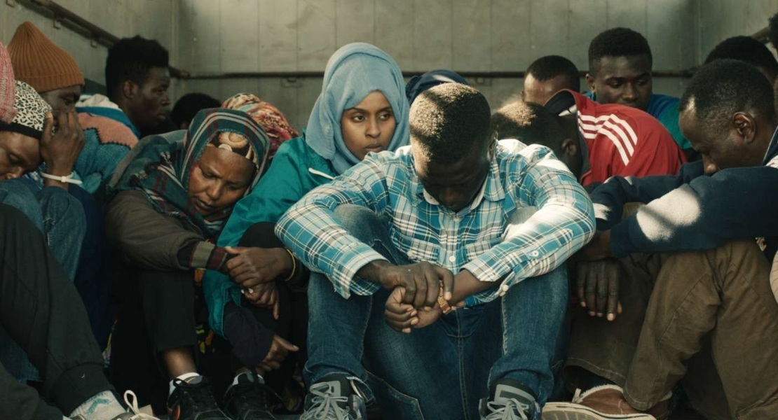 Gli attori Khalifa Abo Kraisse, Olivier Rabourdin, Giuseppe Battiston, Paolo Pierobon, Fabrizio Ferracane nel centro di accoglienza a Tripoli in una scena del film