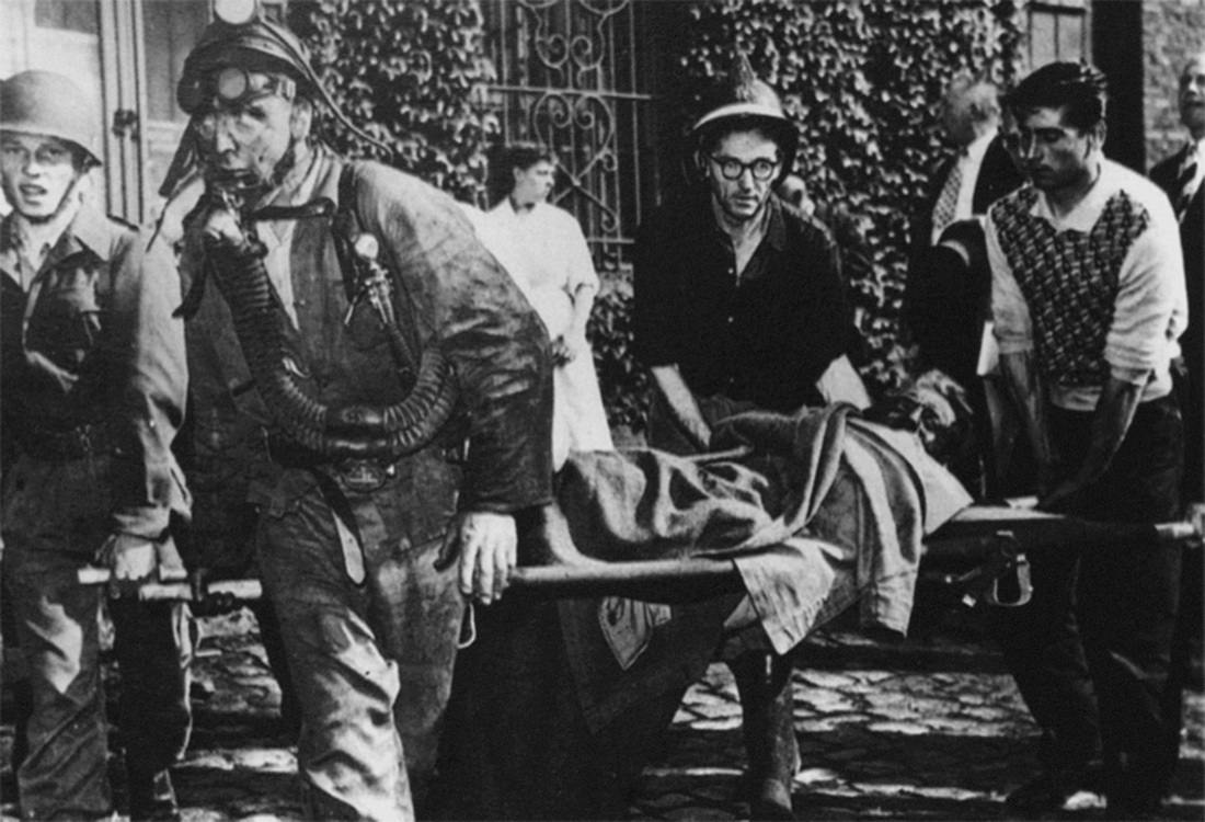 L’incendio si innescò immediatamente e invase presto le gallerie puntellate con travi di legno e prive di sistemi di sicurezza efficaci. Presto dai due pozzi della miniera iniziarono a levarsi alte colonne di fumo, mentre la squadra di soccorso del Bois du Cazier distava ben 1,5 km dall’impianto. Non fu neppure fermato il pozzo di aerazione, fatto che contribuirà ad alimentare l’incendio ed i gas letali da questo sprigionati. Le fiamme furono domate solo 24 ore dopo con l’ausilio dei pompieri di Charleroi, ma i superstiti furono soltanto 13. 262 cadaveri giacevano inghiottiti nelle gallerie, ed i quotidiani uscirono con il titolo a cinque colonne “Sono tutti morti“.