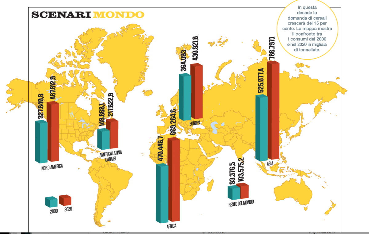 «Le innovazioni tecnologiche hanno consentito di superare alcuni limiti, I prezzi di cibo e carburanti sono sempre più volatili. Il grafico evidenzia le crescenti deviazioni rispetto alla media annuale. In questa decade la domanda di cereali crescerà del 15 per cento. La mappa mostra il confronto tra i consumi del 2000 e nel 2020 in migliaia di tonnellate. Scenari Mondo come evidenzia lo sfruttamento di petrolio e gas non convenzionali» sottolinea Preston. «Ma solo per mantenere l’attuale livello di consumi la ricerca deve procedere a ritmi sostenuti». Chatham House ipotizza una soluzione politica: il club R30 con i 30 maggiori consumatori, produttori, importatori ed esportatori di materie prime. Il compito, non facile, è quello di suggerire strategie chiare e sostenibili nella gestione delle risorse.