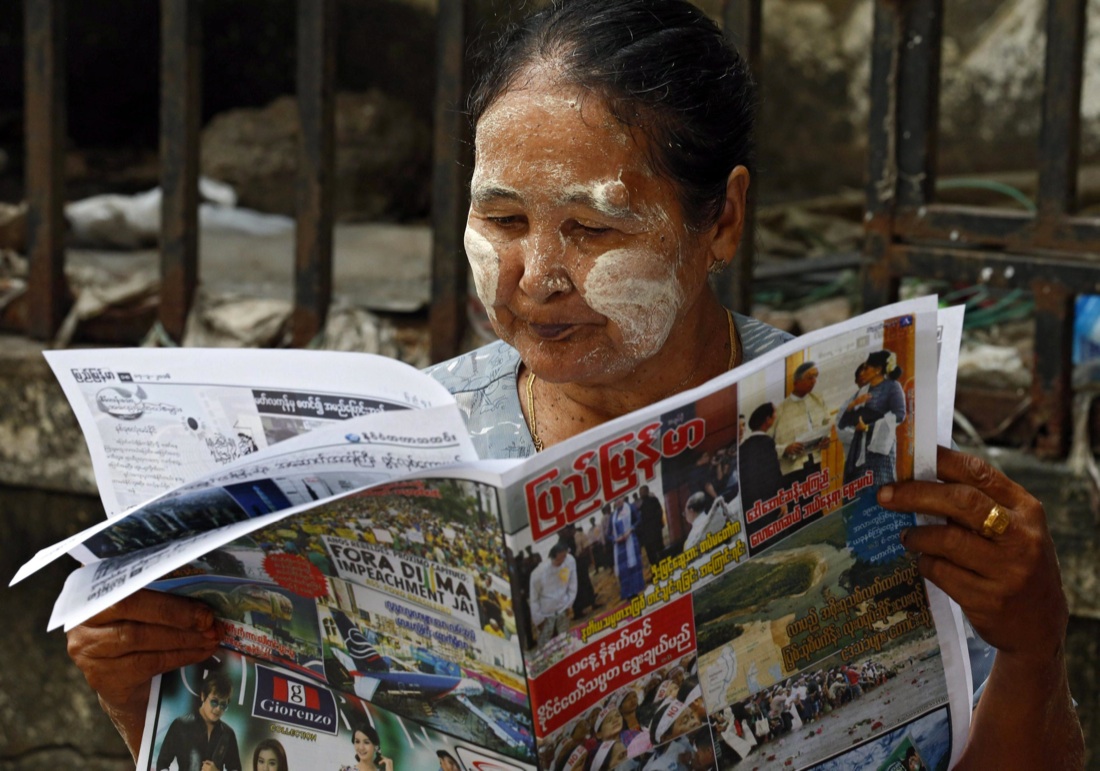 Una cittadina del Myanmar legge un giornale dedicato alle notizie sull’elezione del nuovo presidente, Yangon, Myanmar, 15 marzo 2016