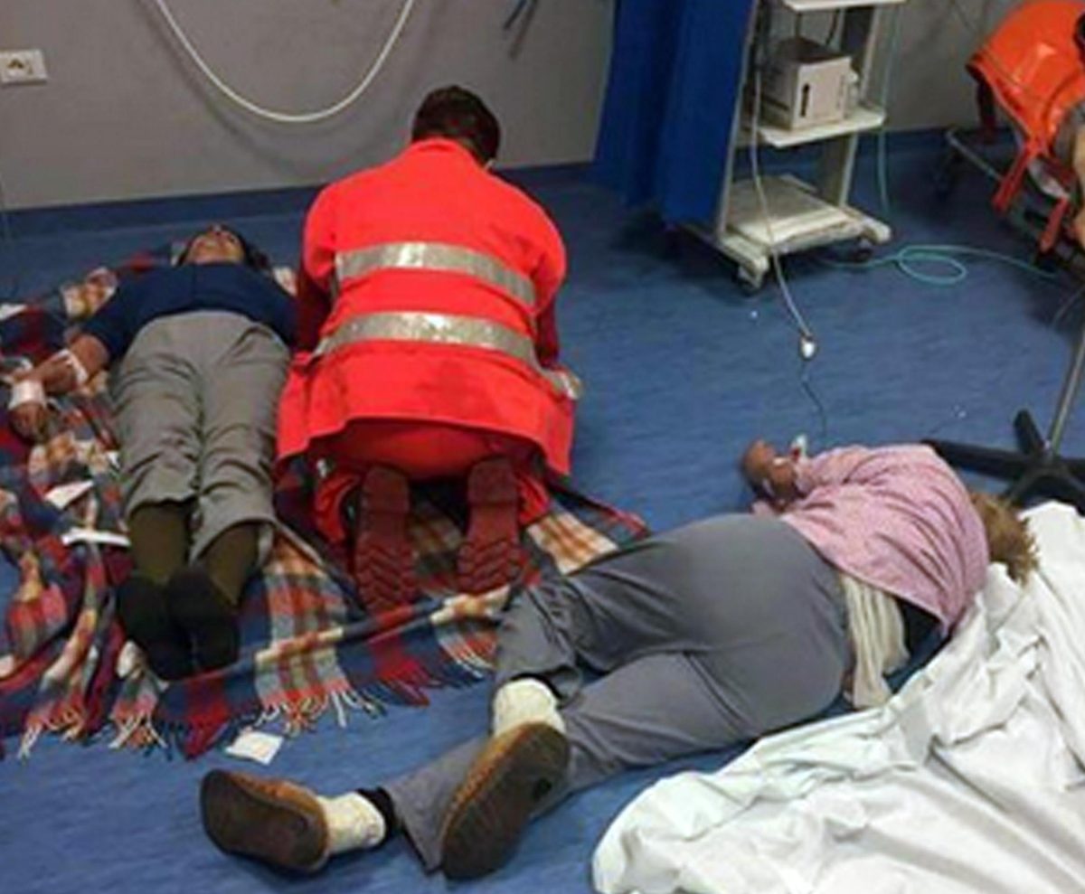 Pancia in sotto, pancia in su, a seconda della postura imposta dal dolore o dalla cura. Chi vomita e gli va impedito di soffocare. Chi ha il cuore in arresto cardiaco e gli va ridata la vita col defibrillatore. I sanitari anche loro a terra, in ginocchio. La sanità in ginocchio. La civiltà in ginocchio.