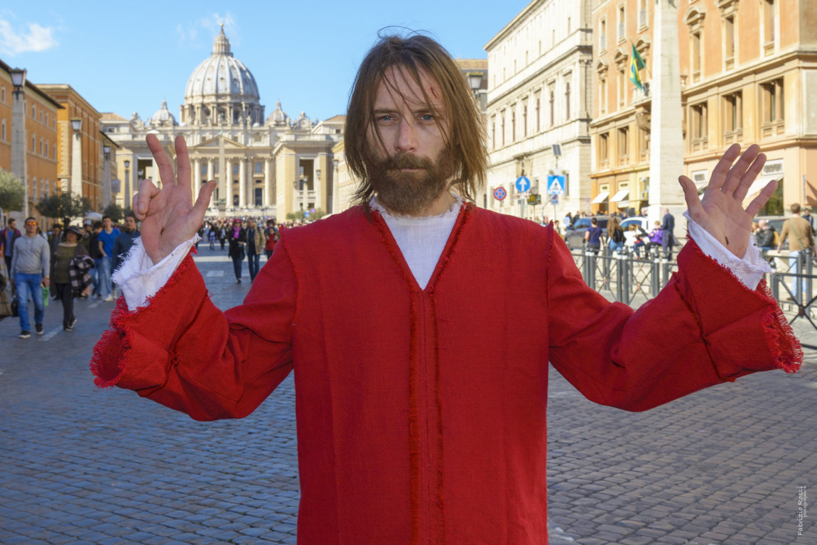 E sì che questo redentore del XXI secolo, come si dice, non si fa mancare nulla. Cammina sulle acque del Tevere, lèvita, fa miracoli, guarisce persone malate, esorcizza un’indemoniata in una perfetta sequenza horror, resuscita un morto, prova a sostenere con modi divinamente misericordiosi la causa degli immigrati davanti a un loro ricovero, trovandovi però un presidio di energumeni che allo slogan di “prima gli italiani!” lo riempiono di democratiche botte e stesso pestaggio rischia (se non di peggio) quando trasforma in sale la cocaina di una gang di spacciatori.