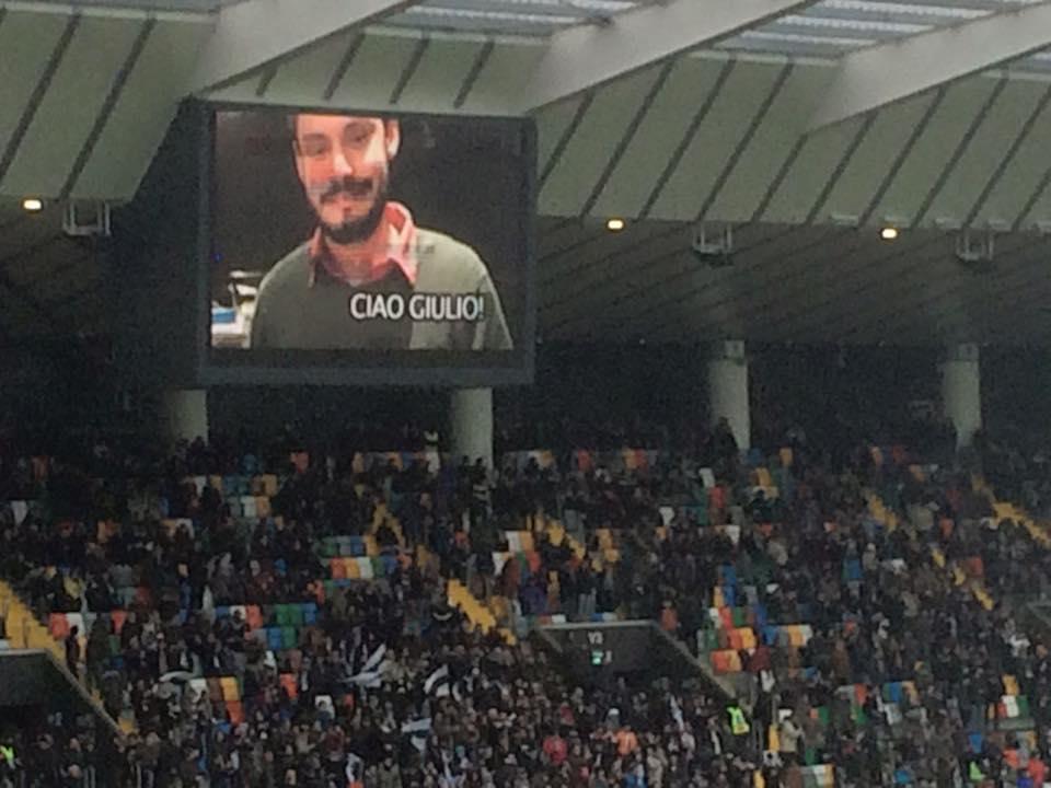 Sul maxischermo del rinnovato impianto, prima della partita Udinese-Bologna, è stata proiettata una foto di Regeni con un applauso del pubblico presente