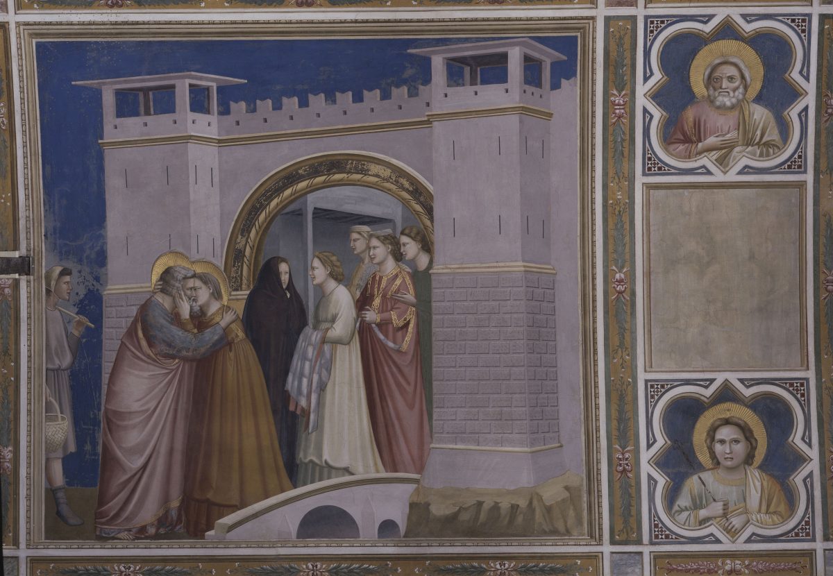 Gioacchino è uscito da Gerusalemme dopo essere stato cacciato dal Tempio per manifesta sterilità (e quindi non benedetto da Dio). E si ritira presso i pastori delle montagne. Mentre è lontano Anna, convinta di averlo perduto e di essere rimasta vedova, ha il miracoloso annuncio di un angelo apparso nella sua casa che le rivela che sarà presto madre. Nel frattempo, riparato fra i pastori, anche Gioacchino sogna un angelo, che lo rassicura perché Dio ha ascoltato le sue preghiere e lo esorta a tornare a casa dalla moglie. La scena fatale mostra l’incontro tra i due, che secondo lo Pseudo Matteo (3,5), avviene davanti alla Porta Aurea di Gerusalemme, dopo che entrambi sono stati avvisati dai messaggeri divini. Da sinistra, da fuori, proviene Gioacchino, accompagnato da un pastore; e da destra Anna, seguita da un corteo di donne amiche festanti, studiate accuratamente nelle acconciature e negli abiti. I due sposi si vengono incontro e, subito fuori dalla porta, all’altezza di una delle torri delle guardie (di cui sentiamo lo sguardo dietro le feritoie), su un ponticello, si scambiano un bacio decisivo che allude alla procreazione: infatti Anna risulta subito incinta.