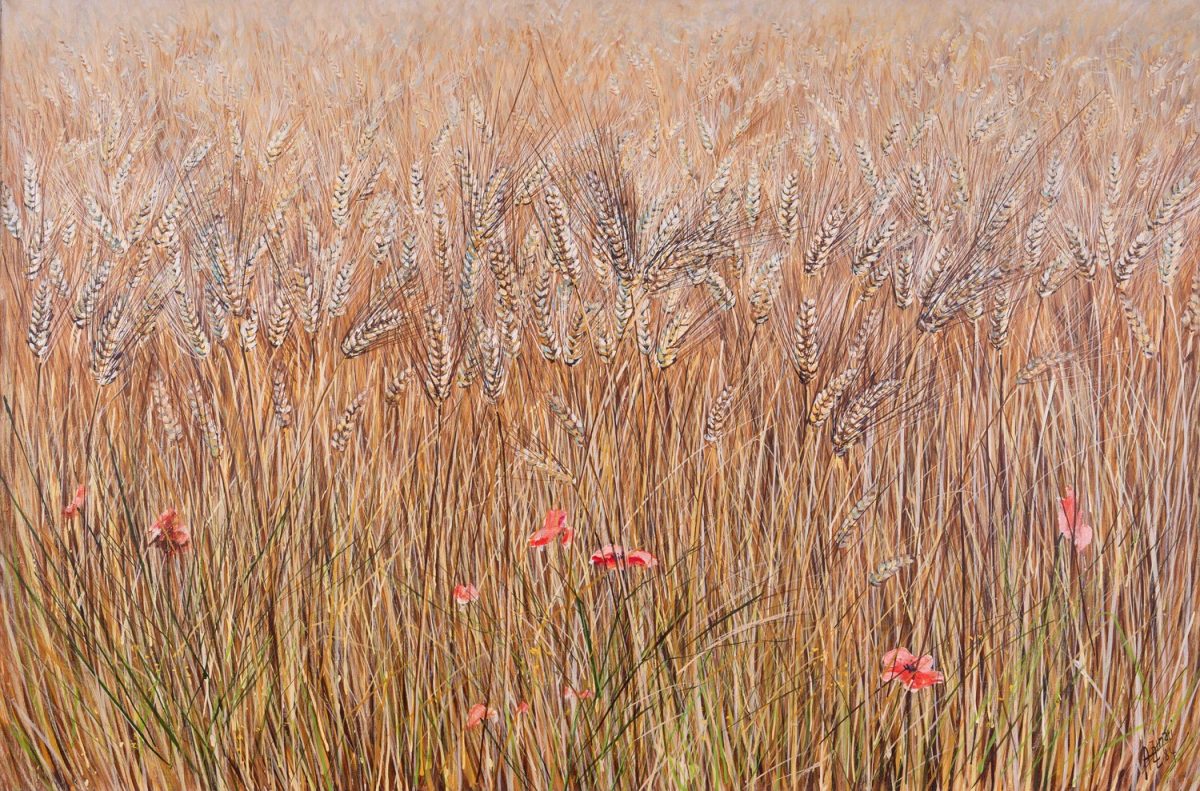Le distese di piante oscillanti per via del vento, bloccate in un attimo che non ferma però il concetto del moto permanente, nei suoi quadri riescono a sviluppare una fisicità ambientale tutta sensoriale, facendosi spazio avvolgente che copre tutto il campo visivo di chi guarda inducendolo a una reazione di carattere emotivo, di notevole intensità. Non vuole più, Azzinari, che nei suoi campi si contempli, vuole che ci si immerga come in un’esperienza di vitalistico trasporto. Insomma, il vento di Azzinari, riprendendo Montale, esiste non per se stesso, ma perché sia goduto. Lungi dall’essere una minaccia, è amico propizio che tutto smuovendo tutto vitalizza.