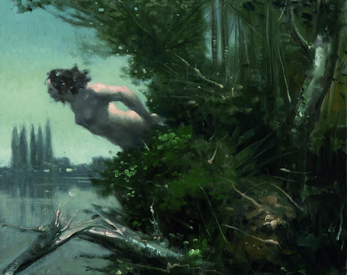 Eccolo oggi con un dipinto di ispirazione mitologica: In acqua dolcissima. Una ninfa appare, mentre si spinge dal bosco sull’argine verso l’acqua perlacea del fiume. Quella luce l’ho vista, quel cielo, quel verde li porto dentro. Di questi luoghi del fiume, più vicini al Delta, ci racconta Lucio Scardino, ricordandoci il Po a Pontelagoscuro di Mimì Quilici Buzzacchi e i cieli grigi di Galileo Cattabriga.
