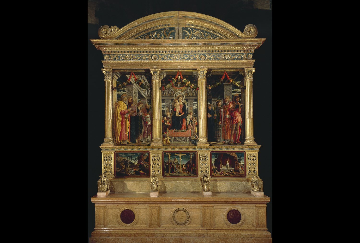 Passiamo alla Pala di Orzinuovi, dipinta da Moretto intorno al 1525, è una pala d’altare nella tradizione veneziana della «Sacra Conversazione». L’artista impagina il tutto secondo un criterio prospettico molto avanzato: la scena diventa un cubo in cui il pavimento aggetta, il trono sta al centro come un parallelepipedo e le colonne sono appena accennate per dare la sensazione di un arco, forse un chiostro, comunque un’architettura che apre verso l’esterno. Nello spazio tra le colonne è posta una ghirlanda. Il modello di questa composizione risale a circa 80 anni prima: è il Trittico di San Zeno di Andrea Mantegna, dove compare una struttura di marmo simile a questa, accompagnata da ghirlande che scendono dall’alto e sostengono il panno dietro la Vergine. Sono le ghirlande dei sarcofagi antichi che utilizza Squarcione di Padova, maestro di Mantegna. Questi mostrava ai suoi allievi con gli scavi di antichità da cui emergevano appunto sarcofagi con elementi decorativi a ghirlanda. Il termine tecnico della ghirlanda da cui pende della frutta è «encarpo» e si ritrova in tutti i pittori che hanno lavorato a Padova con Mantegna: Moretto intende dunque rendere omaggio alla grande pittura quattrocentesca, a Mantegna, a Padova, a un classicismo ritrovato di cui c’è ancora memoria.