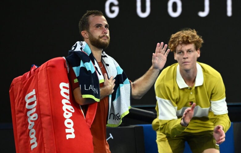 L'azzurro supera facilmente il primo turno agli Australian Open contro il francese che lascia il campo in lacrime