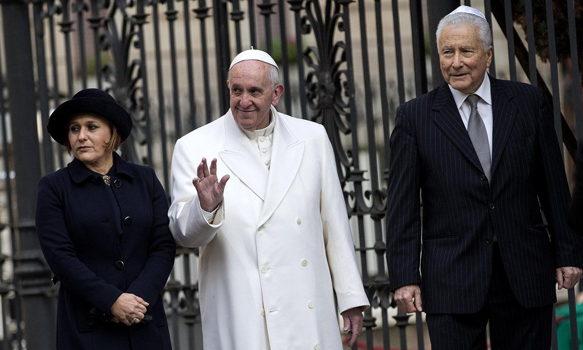17 gennaio 2016. Papa Francesco al suo arrivo presso la sinagoga a Roma accompagnato dalla presidente della Comunità ebraica di Roma, Ruth Dureghello e del presidente dell’Unione delle Comunità ebraiche italiane, Renzo Gattegna.