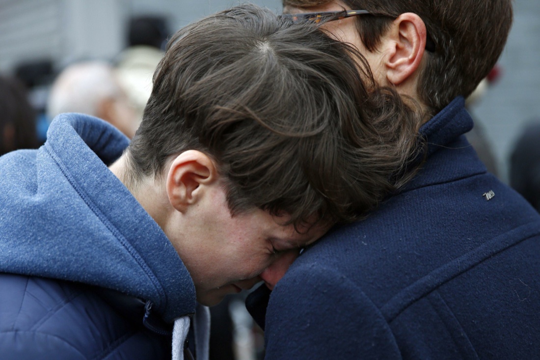 Abbracci tra i superstiti degli attentati di Parigi prima di essere portati via da alcuni autobus in sicurezza – 14 novembre 2015
