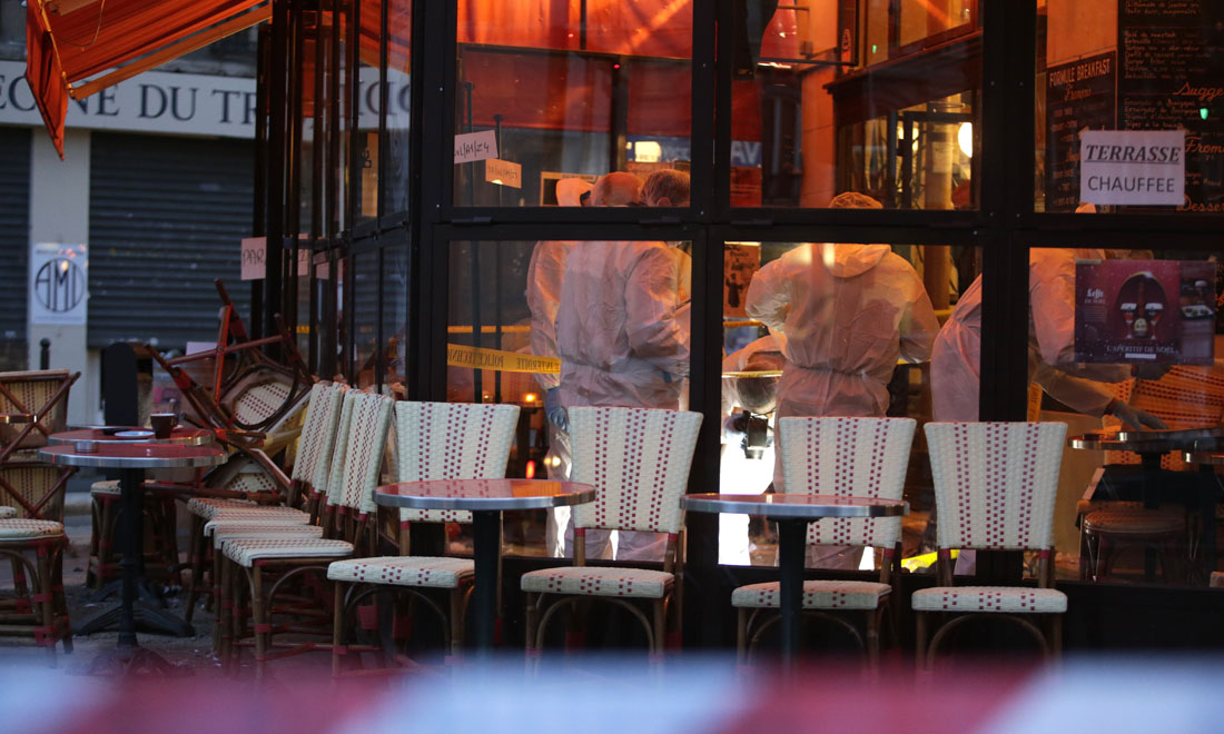 La polizia francese raccoglie tracce nel café Comptoir Voltaire sede di uno degli attacchi terroristici – Parigi 14 novembre 2015