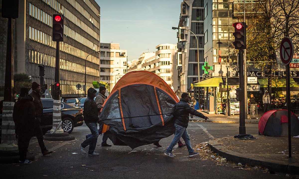 3 novembre 2016. Dei migranti accampati vicino alla fermata del metrò di Stalingrad, a Parigi, spostano una tenda da campeggio da un punto all’altro.