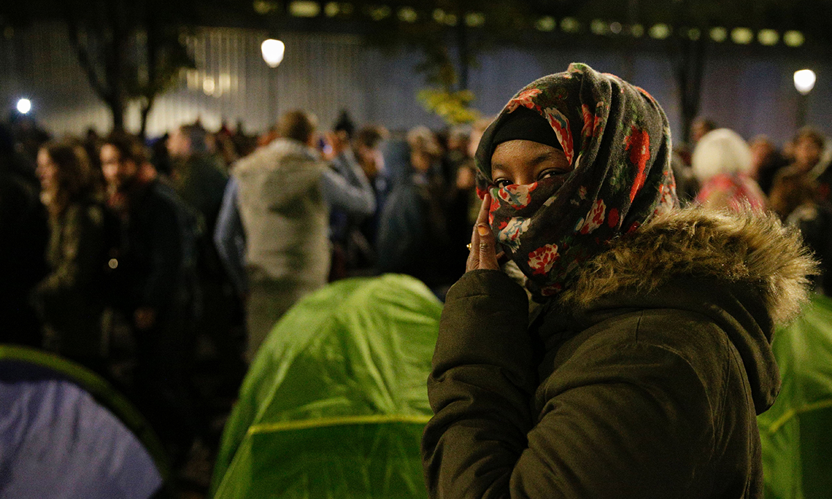 2 novembre 2016. Un momento di una manifestazione in solidarietà ai migranti accampati vicino alla fermata del metrò di Stalingrad a Parigi.