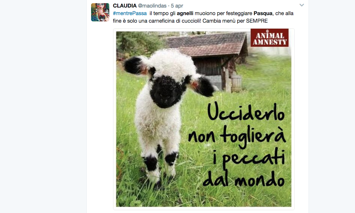 Un’attenzione e una sensibilità animalista sempre più diffusa in Italia e lo specchio di quanto sta accadendo lo si ha dando un’occhiata in giro per i social. Su Twitter il popolo dei “Salva agnelli” è sempre più nutrito e si batte a colpi di condivisione di foto, immagini, impegno e anche di proposte alimentari alternative a quelle consuete con menù vegetariani e idee di cucina creativa.