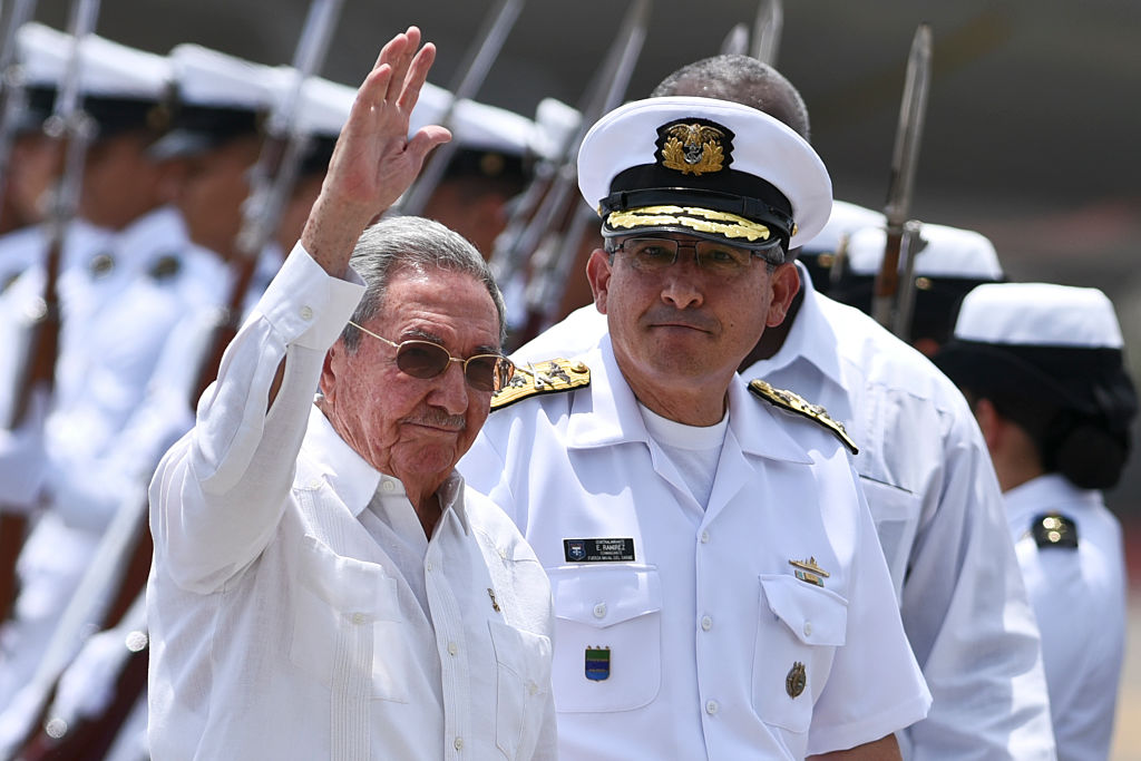 Raul Castro saluta al suo arrivo al Rafael Nunez International airport di Cartagena, Colombia
