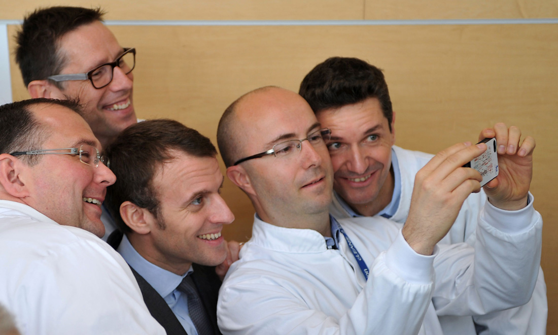 L’allora ministro francese dell’Economia, dell’Industria e del Digitale, Emmanuel Macron, posa per un selfie con dei lavoratori di un’azienda produttrice di insulina della multinazionale farmaceutica Novo Nordisk, a Chartres. 21 aprile 2016.