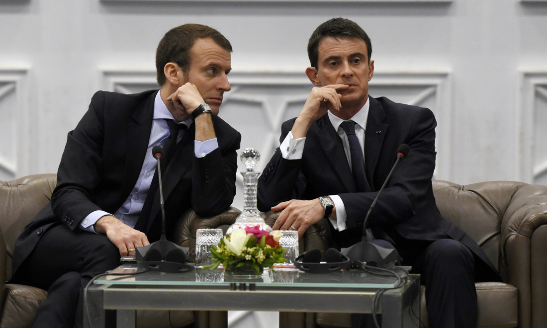 Emmanuel Macron con l’allora primo ministro Manuel Valls all’apertuta di un Forum di 3 giorni dedicato alla partnership tra Francia e Algeria, ad Algeri. 10 aprile 2016.