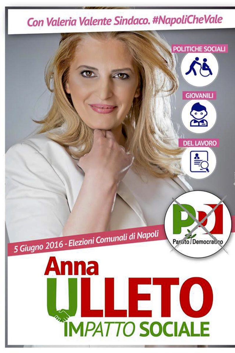 Una immagine elettorale dal profilo Facebook di Anna Ulleto, candidata Pd al Consiglio comunale, una delle due donne indagate dalla procura di Napoli con l’ipotesi di associazione per delinquere finalizzata alla corruzione elettorale, 8 giugno 2016.