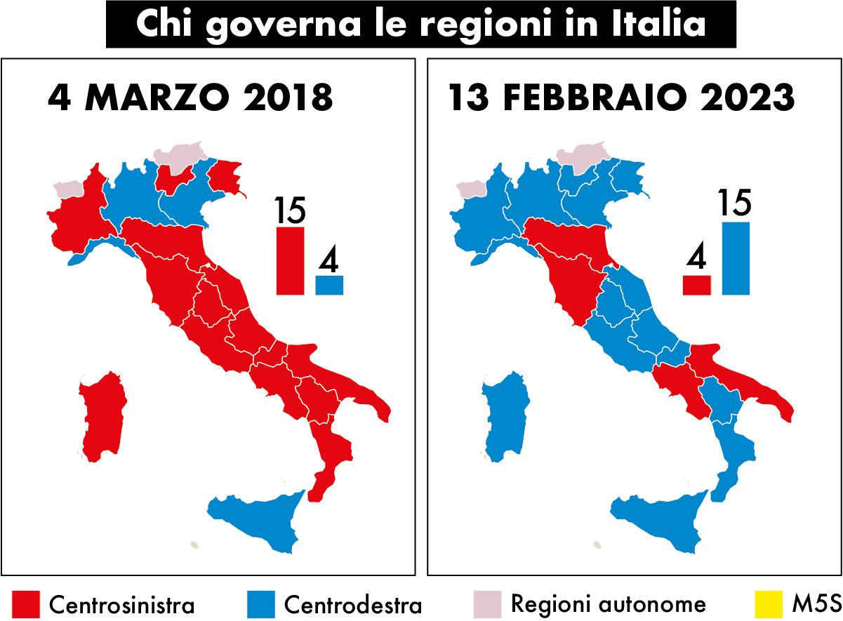 Questa foto riporta infatti la situazione nel 2018 del panorama politico regionale; la sinistra aveva 15 regioni, il centrodestra resisteva in Lombardia, Liguria, Veneto e Sicilia; 15 a 4, un punteggio severissimo ed un’Italia fortemente colorata di rosso. Oggi il cerchio si chiude; oggi il centrodestra arriva proprio a quota 15 con la sinistra alla guida solo di Toscana, Emilia Romagna, Puglia e Campania.