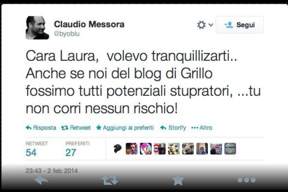 PS Dopo che Beppe Grillo e Gianroberto Casaleggio hanno fatto rimuovere i messaggi del post su Facebook, e averne preso le distanze, Claudio Messora che non è un cittadino qualunque ma il respionsabile comunicazione del M5S ha twittato 140 caratteri che sono peggio, molto peggio, del silenzio. Qualcuno lo avverta che Beppe Grillo ha preso le distanze da quei messaggi. O dobbiamo credere che sia solo uno squallido gioco delle parti?