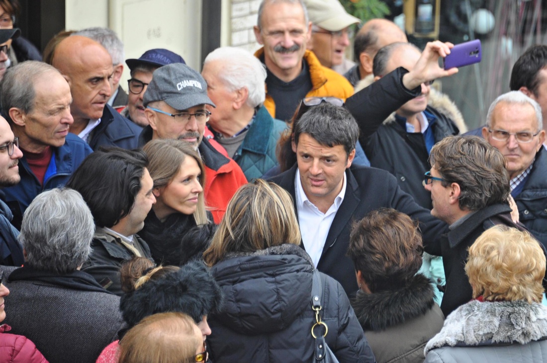 Il premier Matteo Renzi viene accolto da una piccola folla di concittadini al suo arrivo a Rignano sull’Arno, suo paese natale, per recarsi al banchetto del Pd “Italia coraggio!”