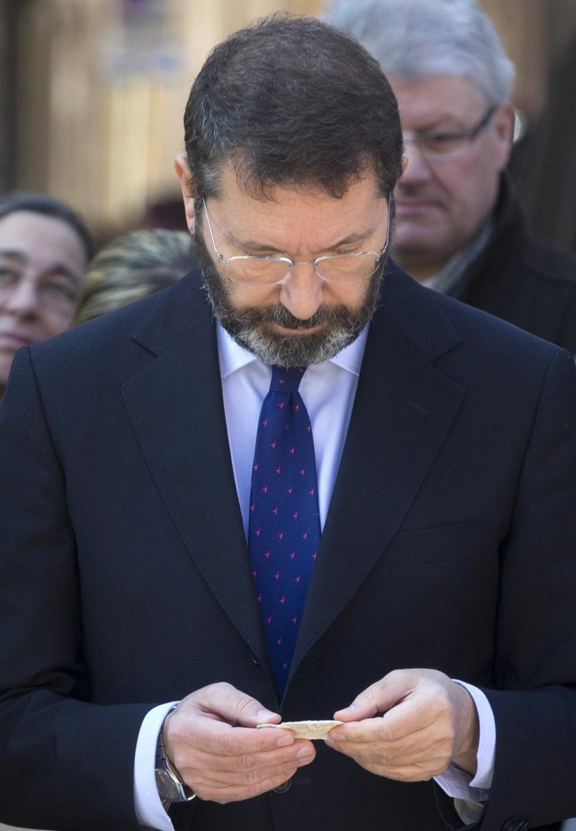 Il sindaco di Roma, Ignazio Marino, tiene in mano una scheggia della fontana della Barcaccia distaccata a seguito degli atti vandalici ad opera dei tifosi del Feyenoord. Roma, 20 febbraio 2015. ANSA/CLAUDIO PERI