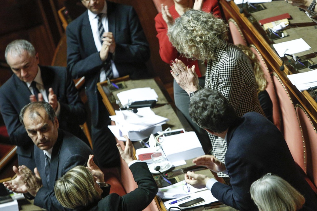 Applausi per Monica Cirinna’ a conclusione del suo intervento nell’aula del Senato, in occasione del voto di fiducia sul ddl in materia di unioni civili, Roma, 25 febbraio 2016.