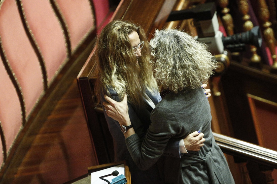 Manuela Repetti (s) e Monica Cirinna’ in Senato durante l’esame del disegno di legge sulle unioni civili, Roma, 3 Febbraio 2016.