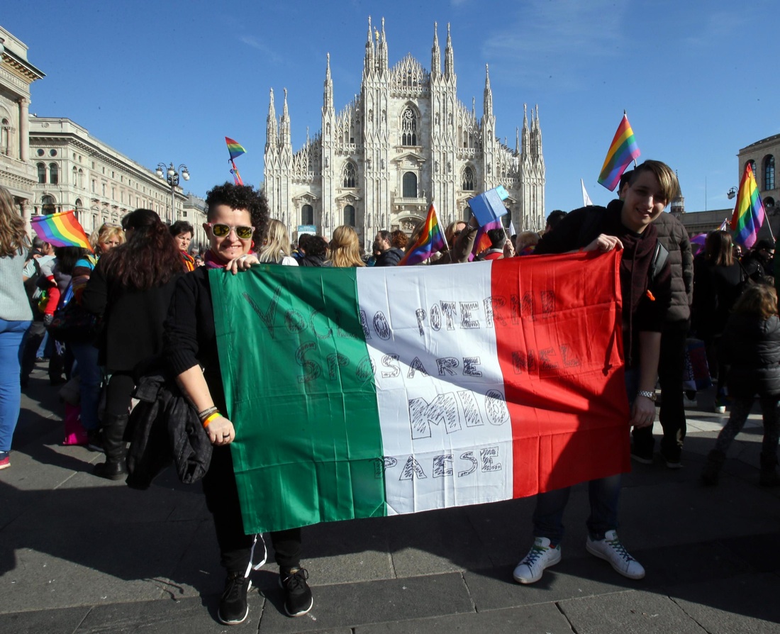 La manifestazione per i diritti civili delle coppie omosessuali organizzata dai Sentinelli di Milano in piazza del Duomo a Milano, 21 febbraio 2016.