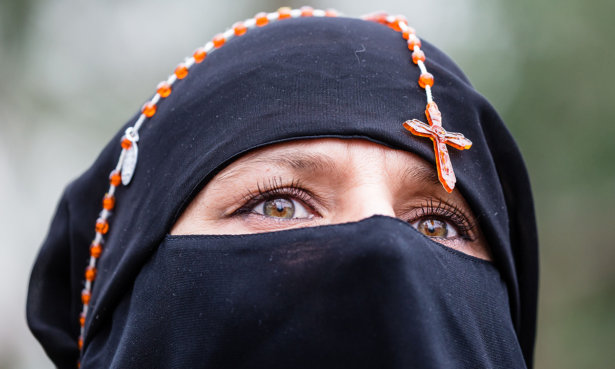 Varsavia, Polonia, 3 ottobre 2016. Una ragazza con il volto coperto da un velo islamico nero e un rosario poggiato sul capo manifesta contro la proposta di legge che vieta l’aborto.