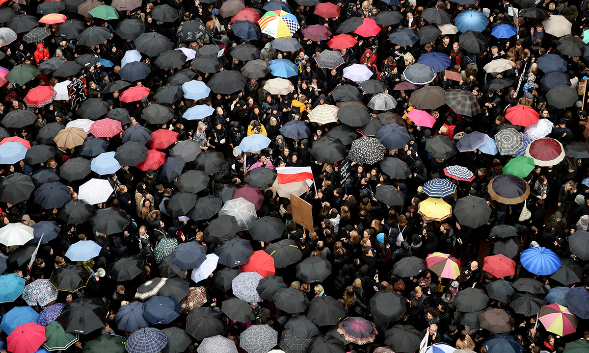 Varsavia, Polonia, 3 ottobre 2016. Una foto dall’alto dei partecipanti alla manifestazione in nero contro la proposta di legge che vieta l’aborto.