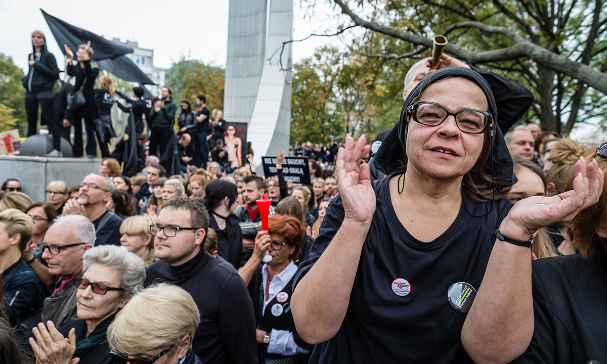 Varsavia, Polonia, 3 ottobre 2016. Manifestanti in piazza vestiti di nero contro la proposta di legge che vieta l’aborto.