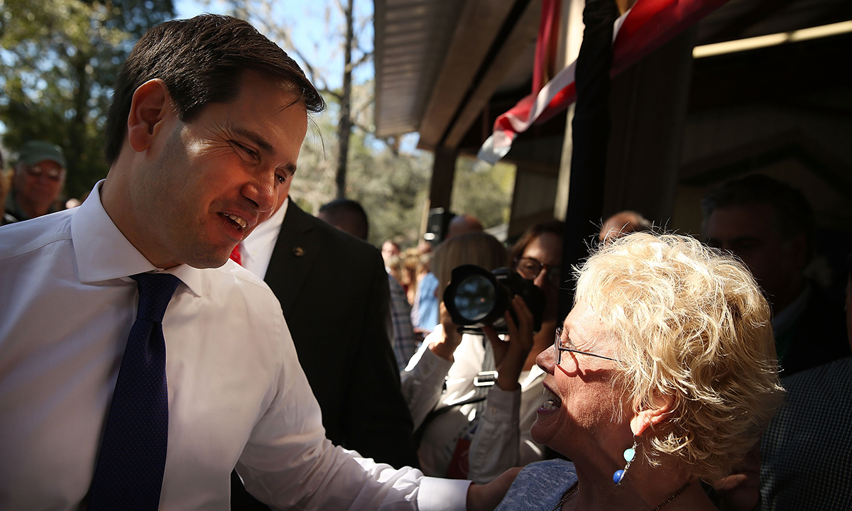 16 febbraio 2016. Il candidato repubblicano Marco Rubio saluta una sostenitrice a Summerville, South Carolina.