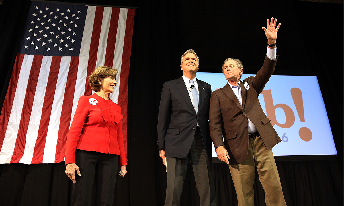 15 febbraio 2016. Il candidato repubblicano Jeb Bush con il fratello, l’ex Presidente George W. Bush e l’ex First Lady Laura Bush durante un evento elettorale a North Charleston, in South Carolina.