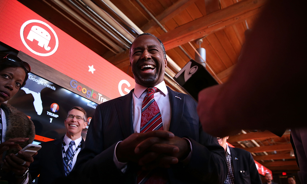 13 febbraio 2016. Il candidato repubblicano Ben Carson prima del dibattito organizzato da CBS News al Peace Center di Greenville, in South Carolina.