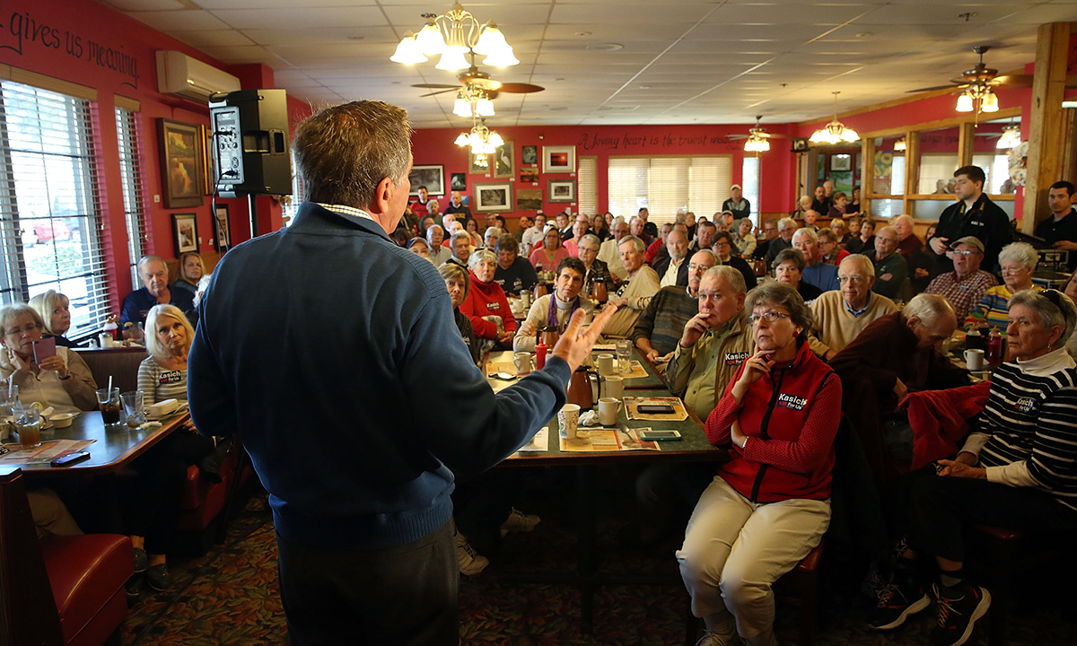 11 febbraio 2016. Il candidato repubblicano John Kasich durante un evento elettorale a Pawleys Island, South Carolina.