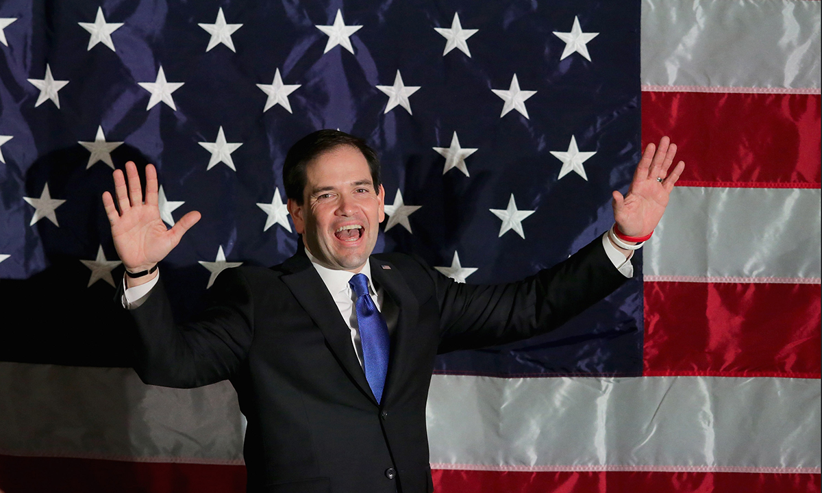 27 febbraio 2016. Il candidato repubblicano Marco Rubio durante un comizio della campagna elettorale allo Space and Rocket Center di Huntsville, in Alabama, in vista del Super Tuesday.