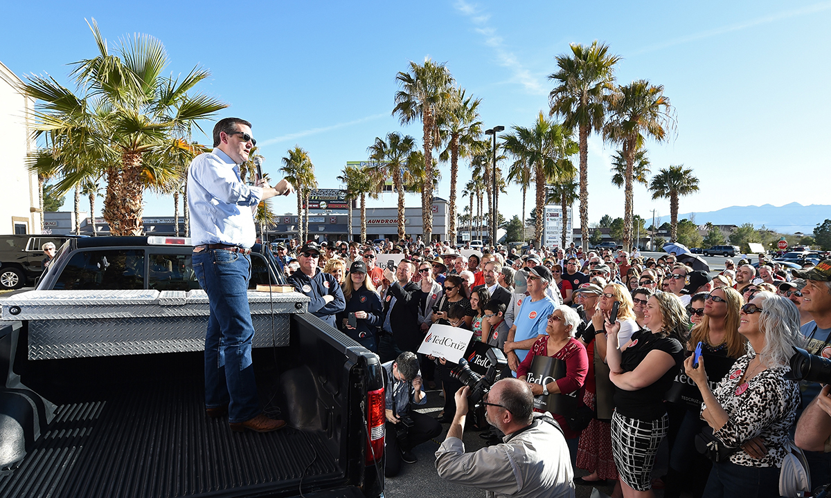 21 febbraio 2016. Il candidato repubblicano Ted Cruz parla ai sostenitori dal un palco improvvisato su un pickup a Pahrump, in Nevada.