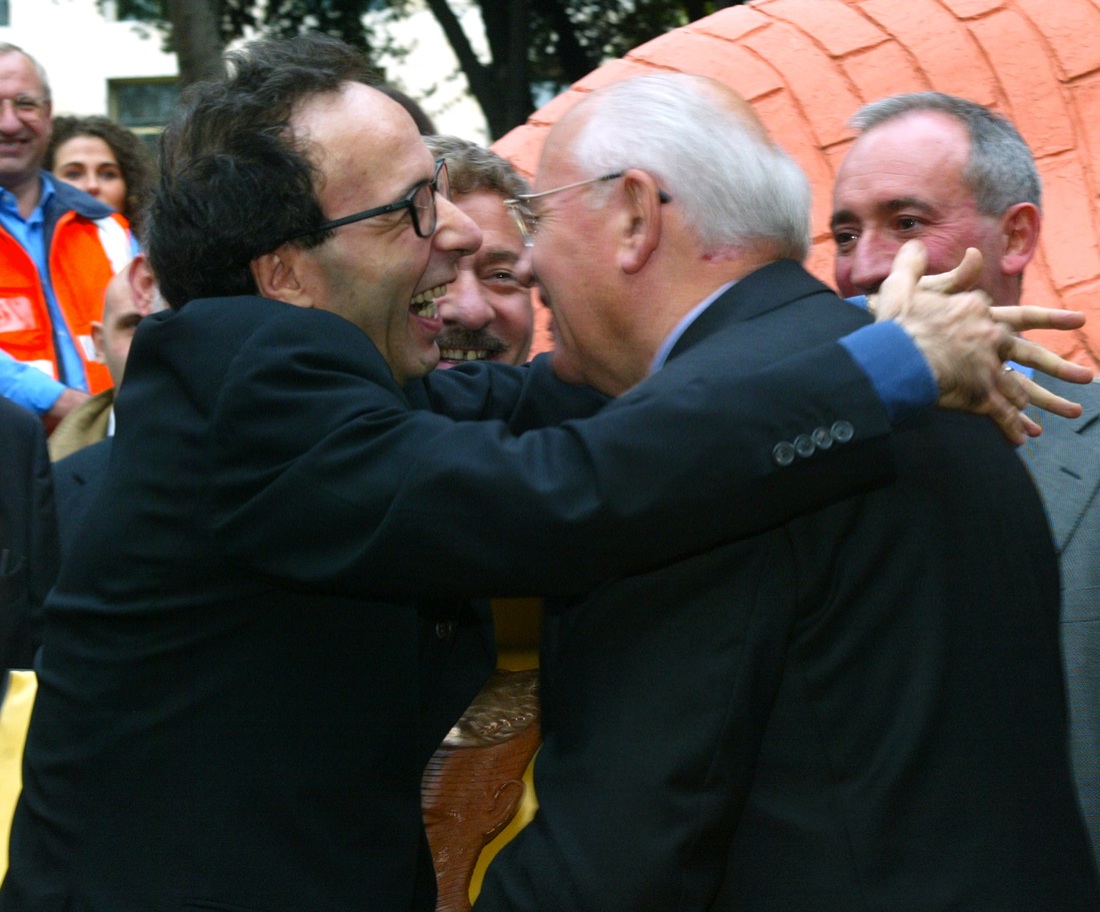Roberto Benigni abbraccia Gorbaciov durante il meeting dei premi nobel a Roma nel 2002.