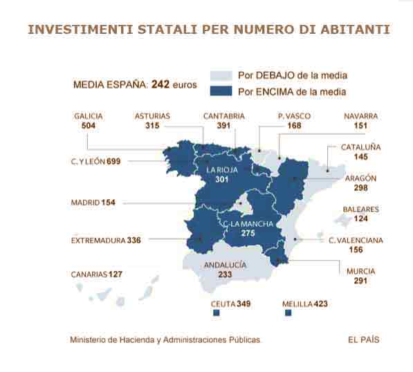 Secondo calcoli del quotidiano di Barcellona La Vanguardia da quando, nel 2011, il Partido Popular è al governo, gli investimenti statali in Catalogna sono diminuiti del 57,9%. Il tutto è racchiuso anche in un grafico che divide la mole complessiva dei trasferimenti dello Stato centrale spagnolo per il numero di abitanti, curato da El Paìs. La fonte è insospettabile: il ministero delle Finanze di Madrid. La Catalogna è una delle cenerentole. Eppure è la locomotiva di Spagna.