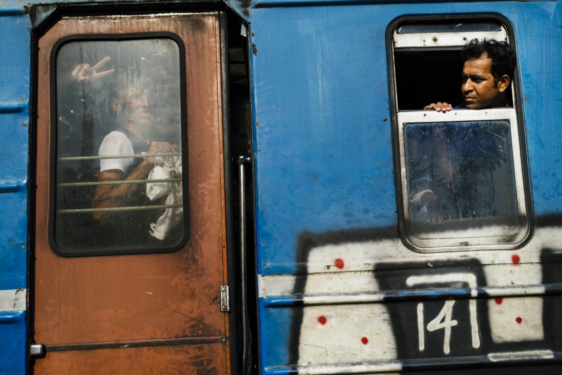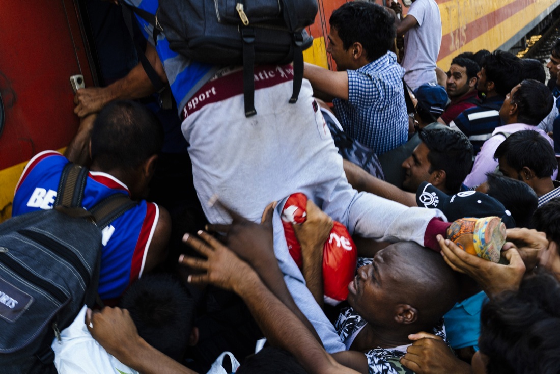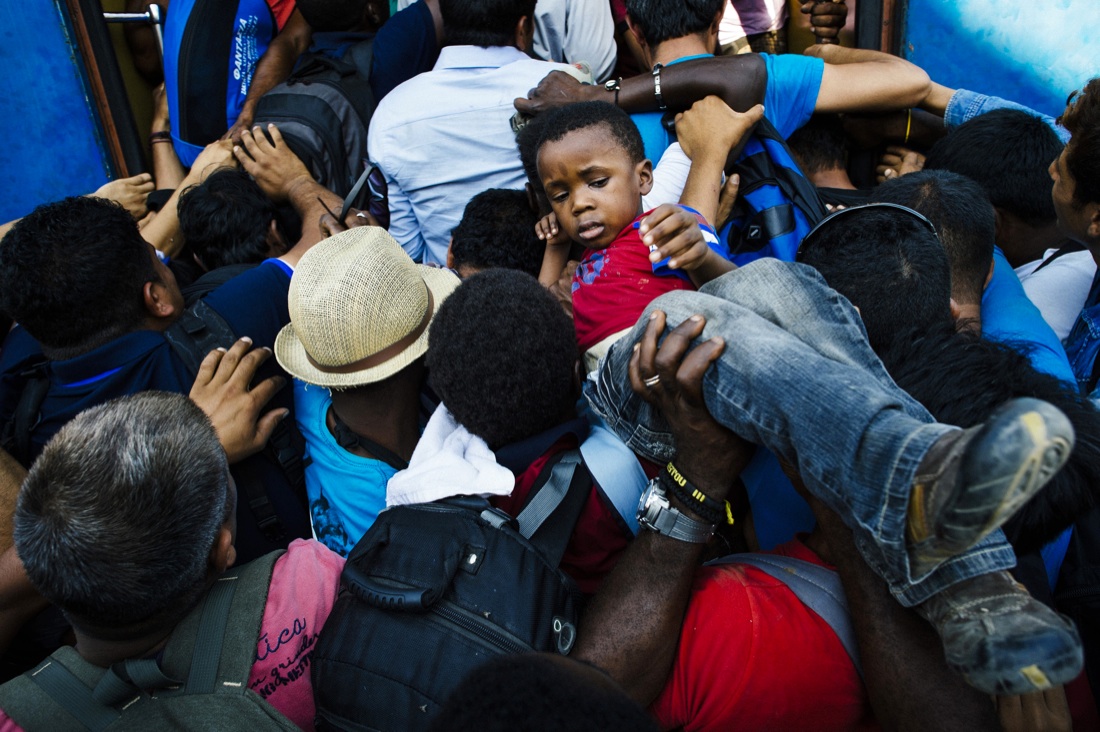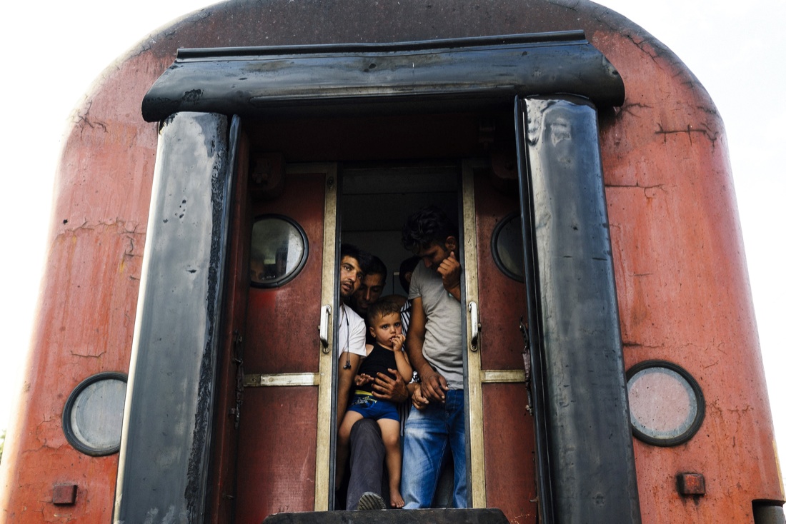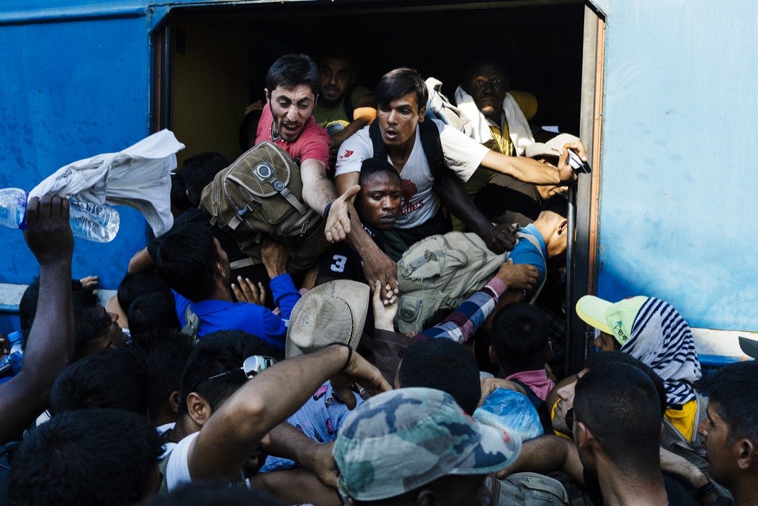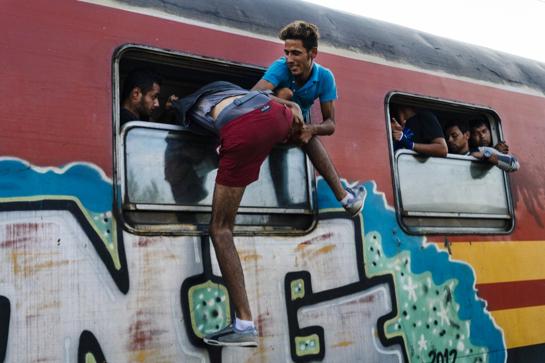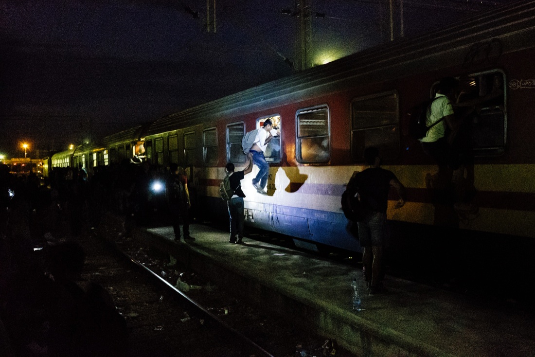 Migranti su un treno diretto in Serbia alla stazione di Gevgelija, sul confine tra Macedonia e Grecia.