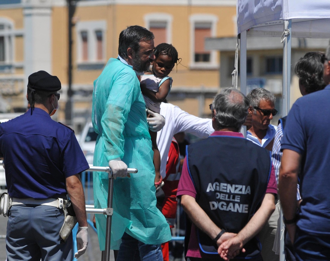 L’arrivo nel porto di Catania della nave norvegese Siem Pilot al servizio di Frontex con a bordo i migranti soccorsi dal pattugliatore Cigala Fulgosi della Marina Militare e le 49 vittime della tragedia del mare avvenuta al largo della Libia., 17 agosto 2015.