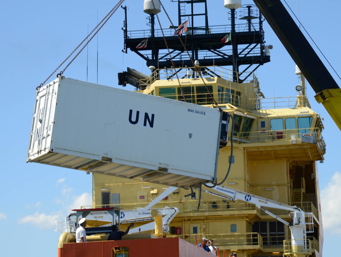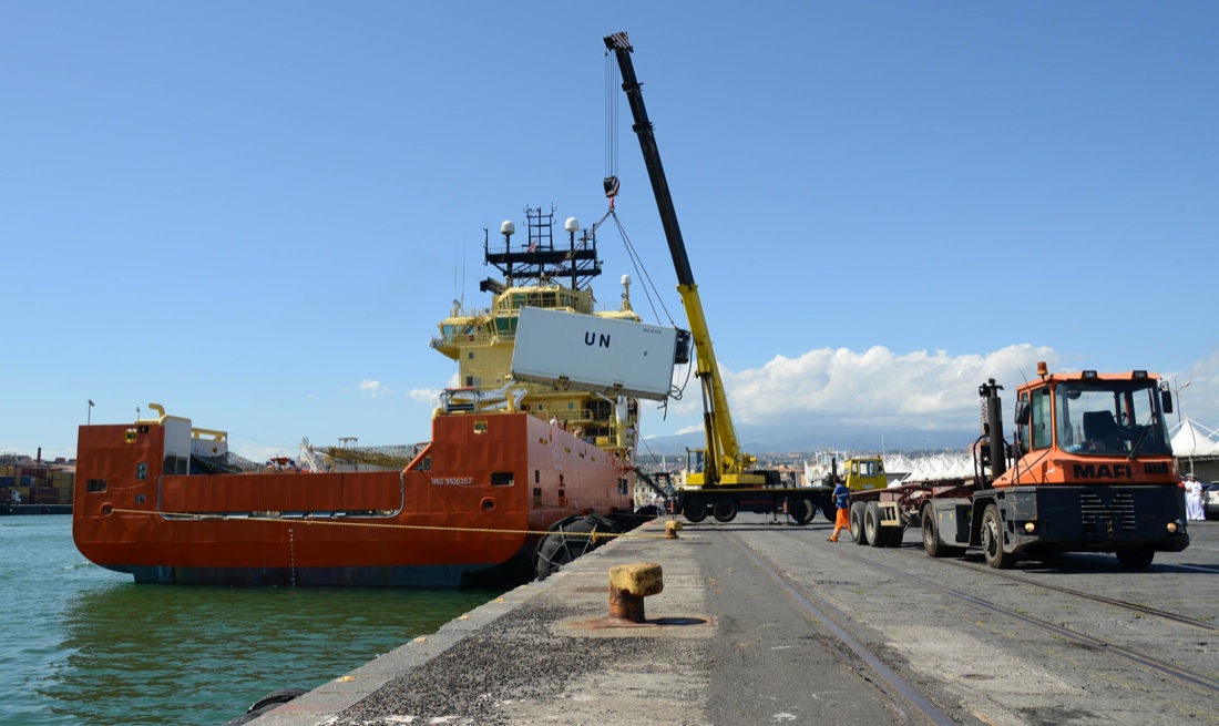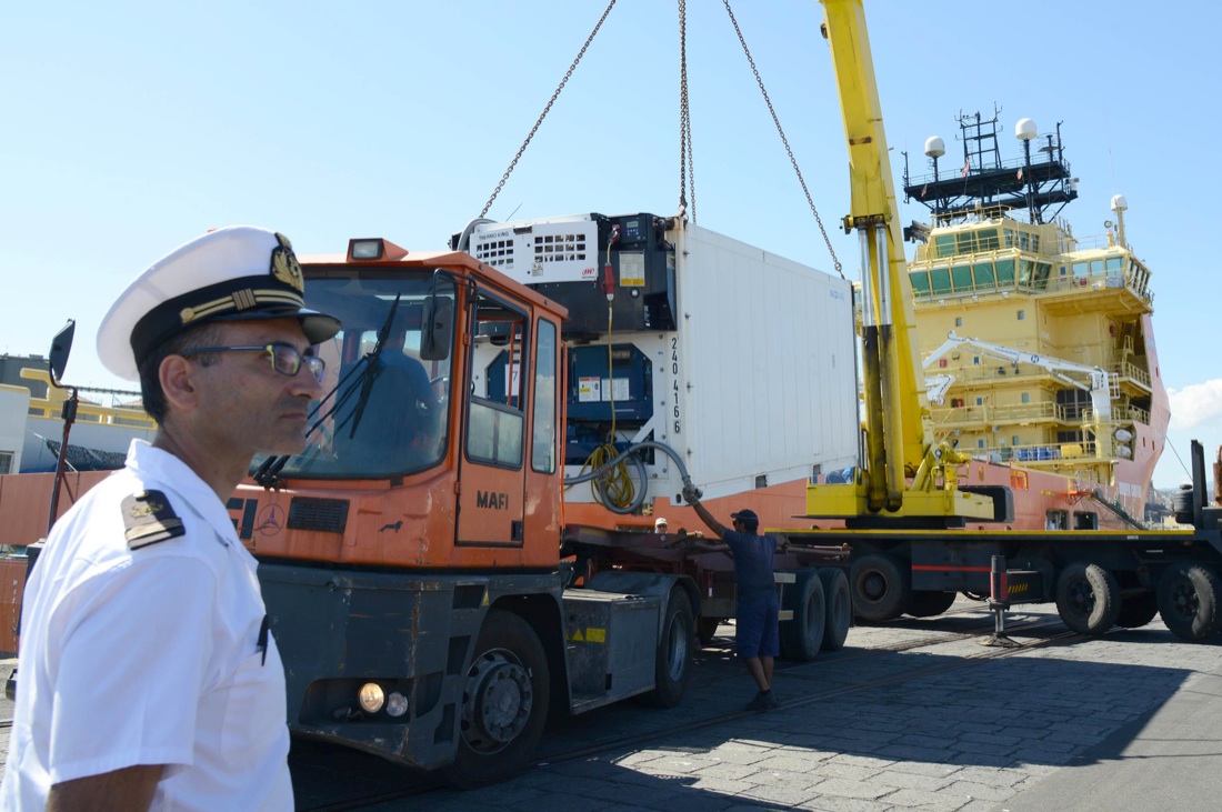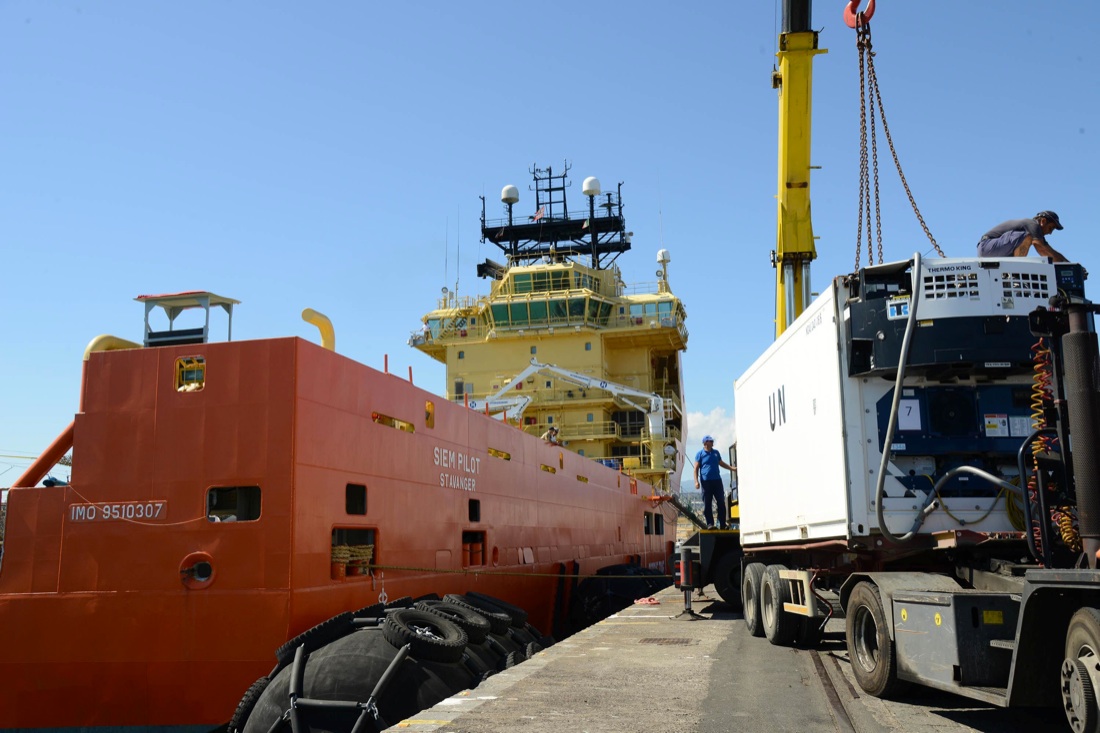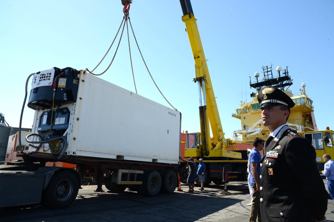 La nave norvegese Siem Pilot con le salme dei migranti, morti durante il naufragio della loro imbarcazione, ormeggiata nel porto di Catania, 17 agosto 2015.