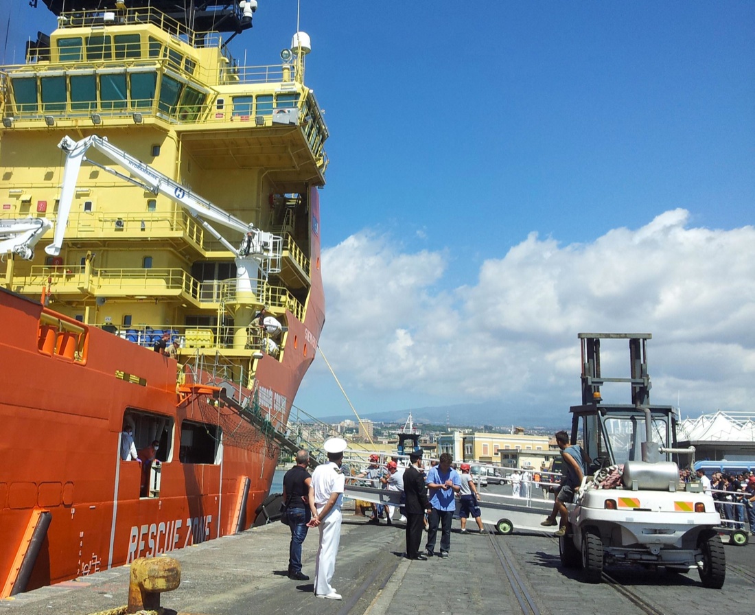 L’arrivo a Catania della nave norvegese Siem Pilot al servizio di Frontex con a bordo i migranti soccorsi dal pattugliatore Cigala Fulgosi e le 49 vittime dell’ennesima tragedia del mare avvenuta al largo della Libia. 17 agosto 2015
