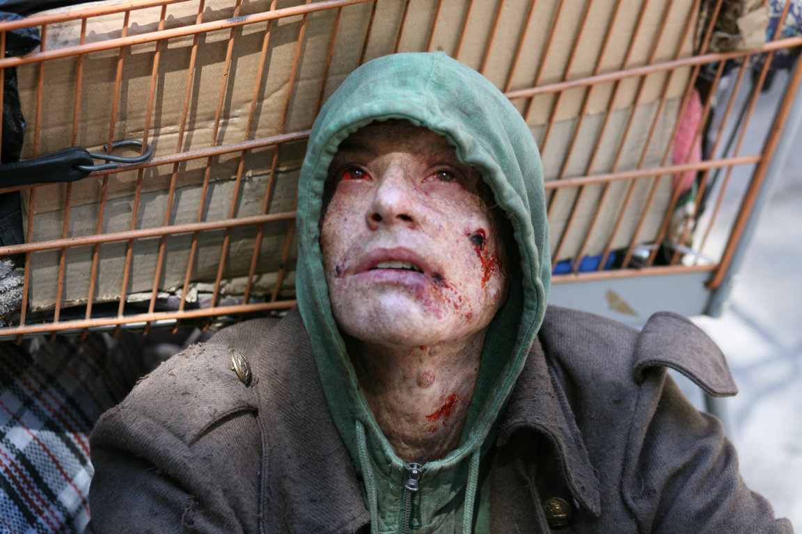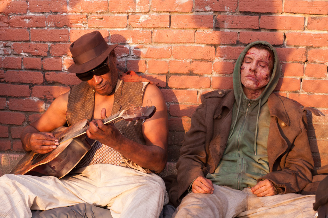 FRANKENSTEIN – Ormai trasfigurato, Adam-Mostro (Xavier Samuel) trova per strada un solo amico, homeless come lui: il bluesman Eddie (Tony Todd)