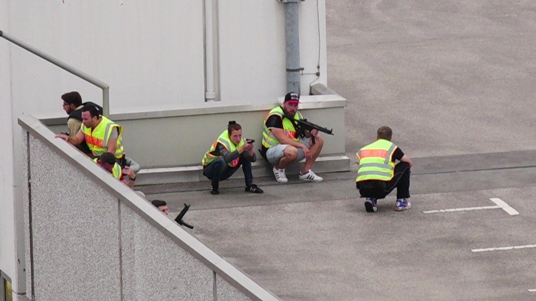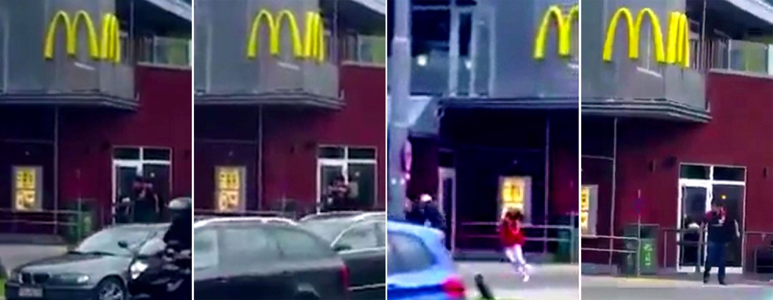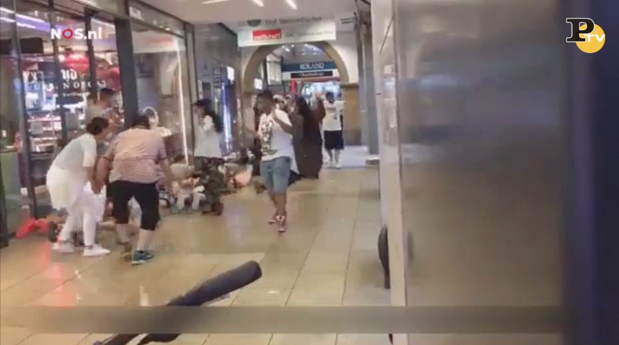 Una combo di frames da un video che mostra uno dei presunti attentatori che esce dal McDonald’s del centro commerciale di Monaco con una pistola in mano sparando indiscriminatamente sulla gente, e una ragazza in fuga. Non si sa ancora chi lo ha pubblicato su twitter.