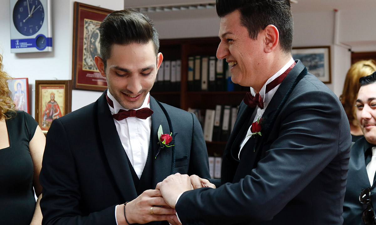 4 marzo 2016. Marios e Stephanos si scambiano gli anelli durante la cerimonia della loro unione civile nell’ufficio amministrativo del distretto di Nicosia, nella parte greco-cipriota dell’isola di Cipro. La loro è una delle prime unioni civili di coppie gay celebrate da che Cipro ha approvato le unioni civili – sia etero, sia omo- nel novembre 2015.